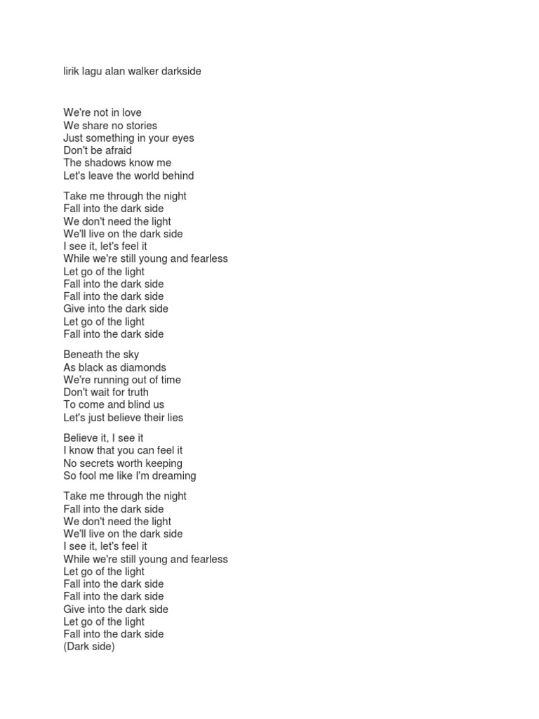 Jatuh menuju sisi gelap. Fall into the dark side. Darkside - Alan Walker Were not in love We share no stories Just something in your eyes Dont be afraid The shadows know me Lets leave the world behind Take me through the night Fall into the dark side.